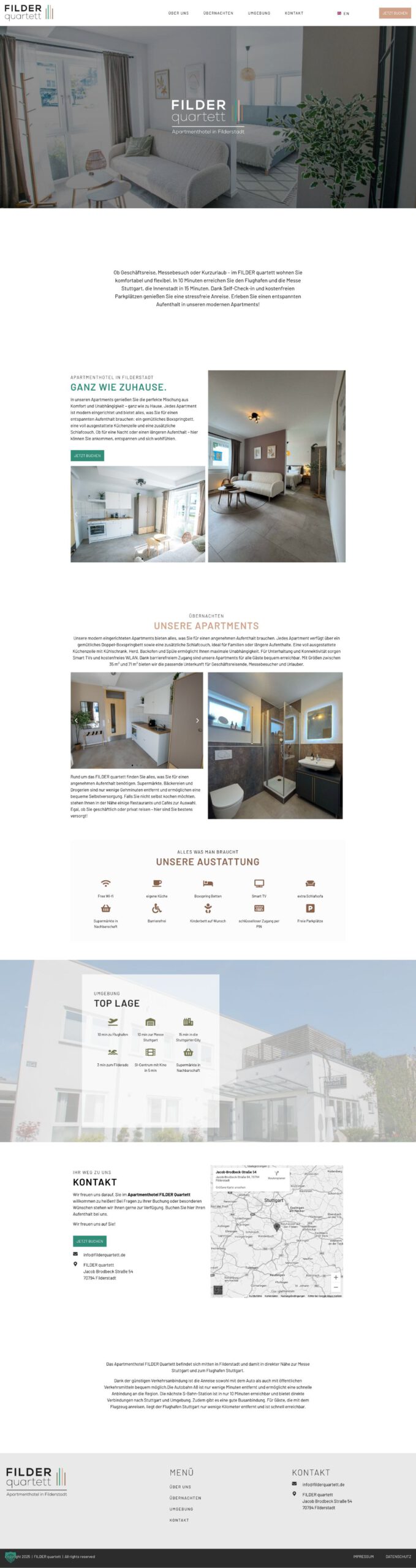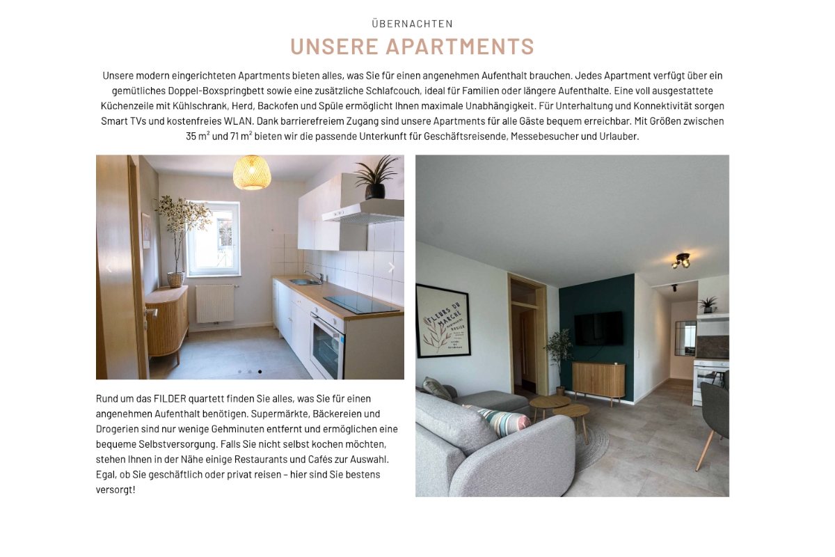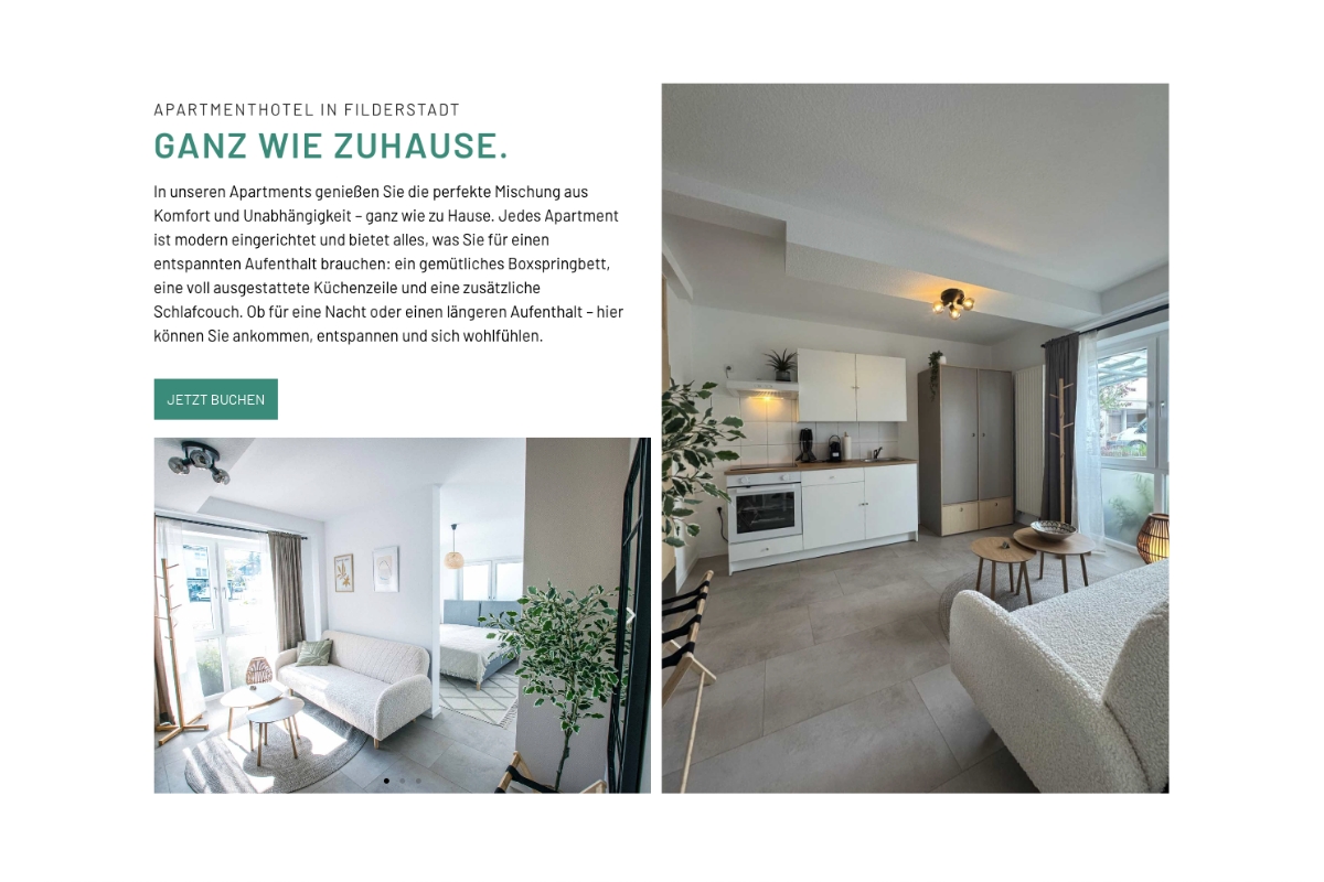 Basti hat in kürzester Zeit ein wunderschönes Apartment Hotel in Filderstadt bei Stuttgart auf die Beine gestellt – mit viel Herzblut, Liebe zum Detail und einem echten Gespür für Design und Komfort. In den Apartments genießen Gäste die perfekte Mischung aus Komfort und Unabhängigkeit – ganz wie zu Hause. Jedes Apartment ist modern eingerichtet und bietet alles, was man für einen entspannten Aufenthalt braucht.