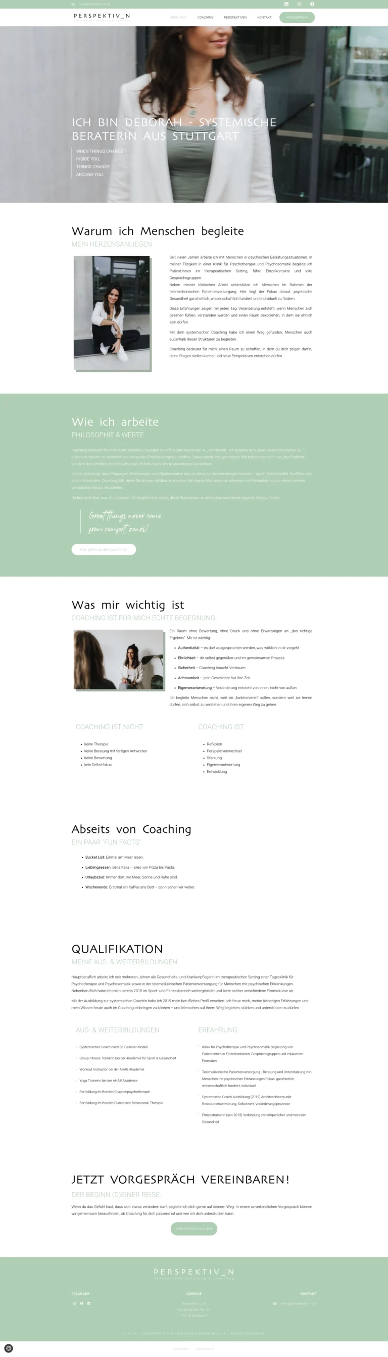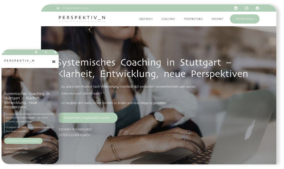 Mit dem Ziel, die Botschaft von Deborah klarer und digital besser sichtbar zu machen, durfte ich für Perspektiv-N Logo, Corporate Identity und Webseite neu aufsetzen. Das neue Logo wirkt prägnanter und moderner – die überarbeiteten Farben verleihen der Marke mehr Frische und spiegeln Deborahs Art noch stärker wider: offen, kraftvoll und nahbar.